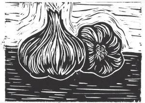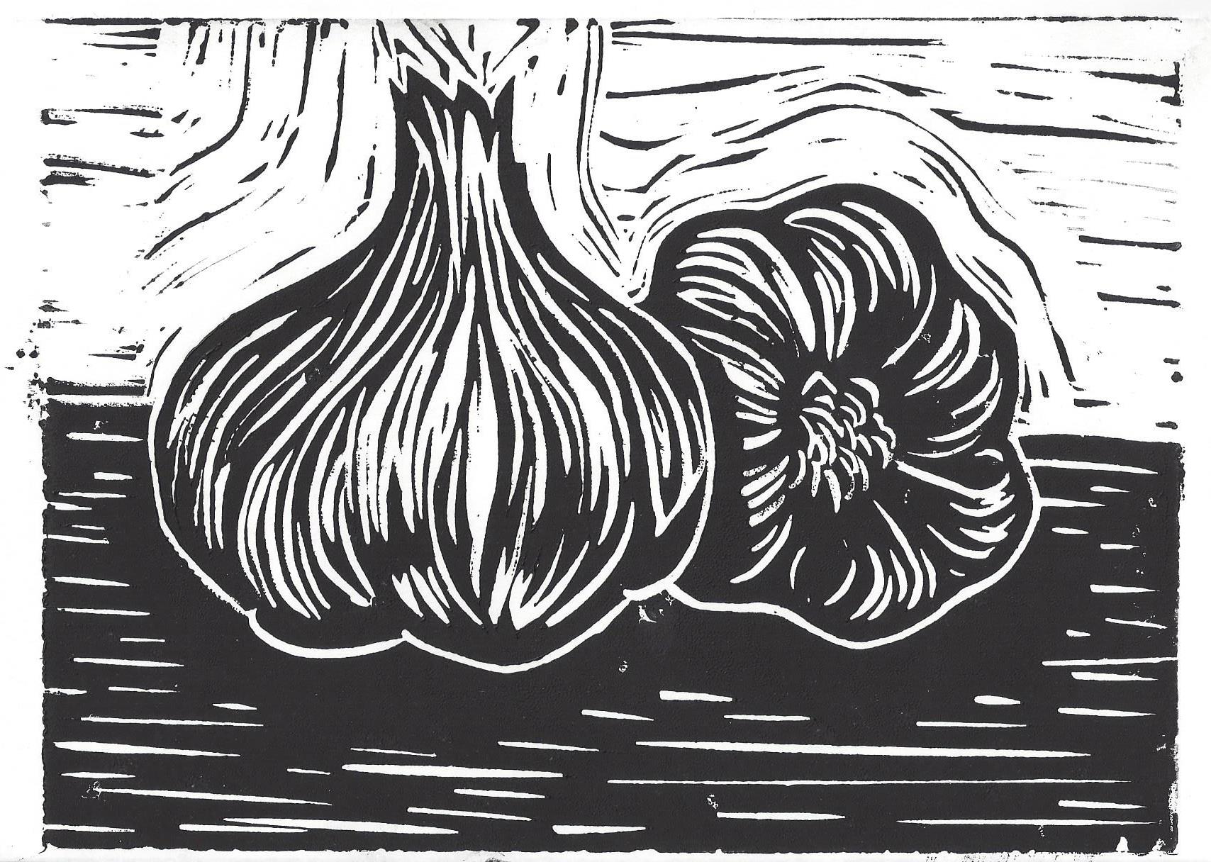 Garlic June 26, 2015June 27, 2015 ~ Layne Scherer Like sea creatures, the textures in food seem ripe* for lino cuts. This one is up in my kitchen right now. *pun intended