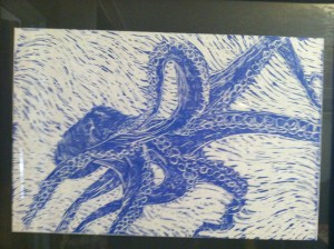 In the creation of the larger octopus, I produced the image on the left first. I tested out the block leaving the background as an untouched field. This can present challenges printing, as I had to be careful to spread the ink smoothly and apply consistent pressure in the transfer across a large area. I liked it, but I thought that a white background might provide more contrast, and I was in love with the linework in the smaller print. After spending painstaking hours carving out the background of that large octopus print, I found that the linework that looked great on a small scale looked cluttered and lacking purpose on the larger print. And, I couldn’t fix it.