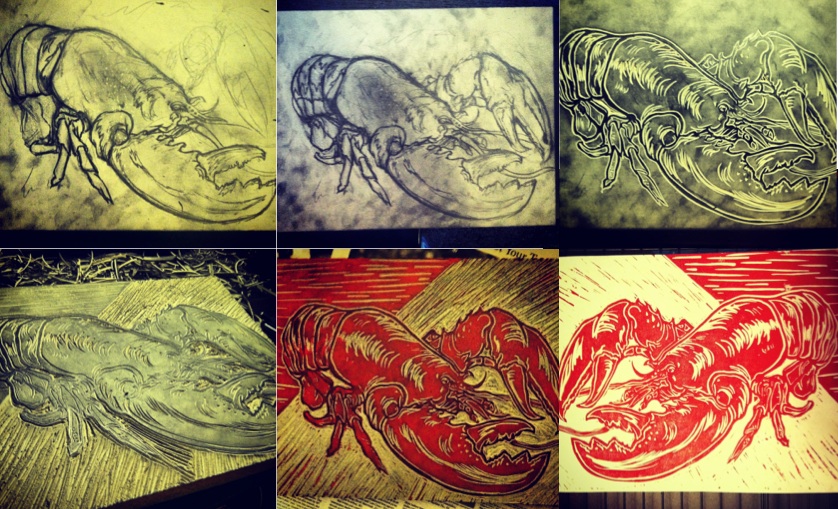 Anyways. That is a long way of saying that even though I had tried to do make a stripped out background in another print and regretted it, I only remembered this lesson about 2/3 of the way through. This resulted in a kind of strange split in the lobster background once I realized that I might be heading down an errant path. Backgrounds have always been a weak spot for me. My HS art teacher would lament that I would draw a figure and leave it unmoored, lacking context in a sea of dead paper. I’m still trying Mr. B! Or I’m still pretending to try.