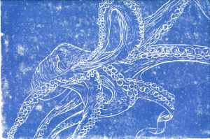 This octopus is based on the smaller octopus (4×6). Not pictured here is the mistake I made in deciding that I also wanted this image to have a white background. It didn’t look as good, and it took forever to carve out all of that space on the block. Live and learn.